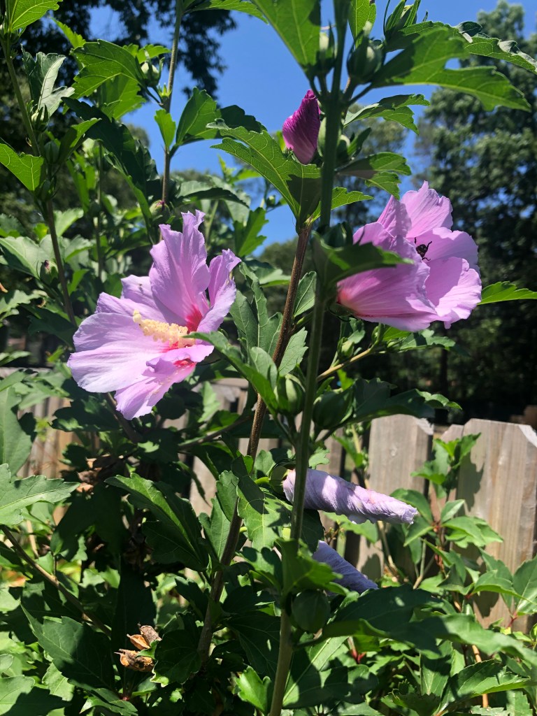When our new neighbors moved in, a little over a year ago, there had been several Rose of Sharon on the edge of their property. Last fall when they put up their stockade fence the Rose of Sharon were where they wanted the fence to go so, we sadly watched as they pulled the bushes out.