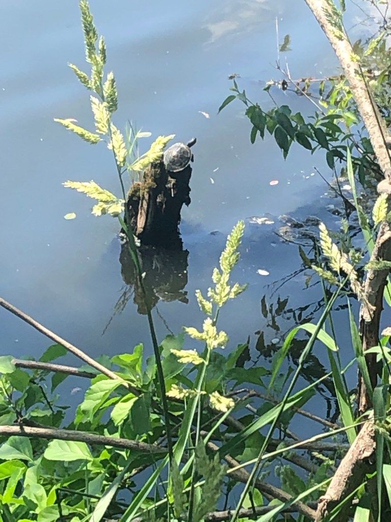 I looked across the lake to where we’d seen the little turtle on the tree stump. “I wonder if our little guy is done with his sunning and is headed back to the cove?”