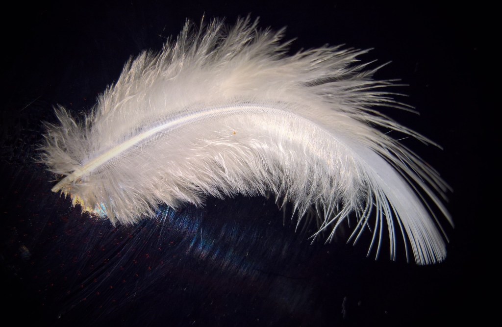I was slipping into my own coat. “Hey, did I tell you that while I was sweeping the kitchen, after breakfast this morning, I found a white feather about this big?” I held my pointer finger and thumb about two inches apart.