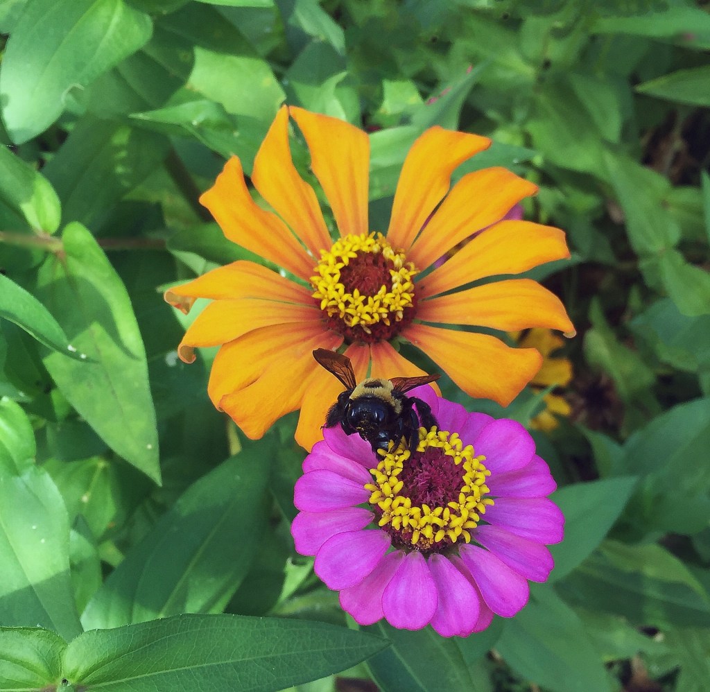 He was working in his garden on the other side of the yard. “A carpenter bee just pinged off my head!” I cried.