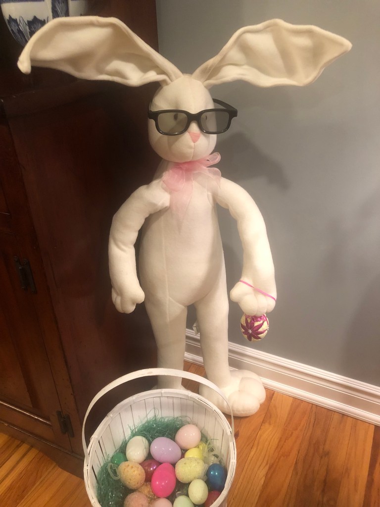 I looked around the living room and into the dining room. He was absolutely right. “I do like to decorate with bunnies this time of year.” I admitted. “But you have to agree they’re adorable!” I went over to the three foot high white bunny standing in the corner holding a knockoff Faberge’ egg in his paw.