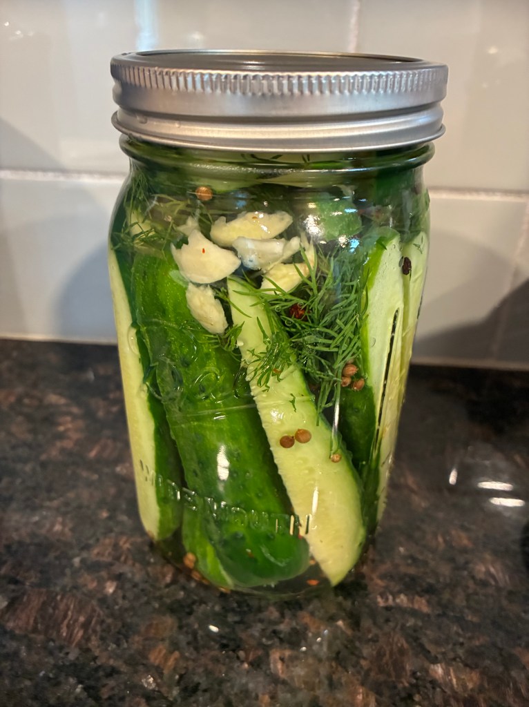 Scrolling through my phone I pointed to the bag of cucumbers in our cart. “Kirby cucumbers. Check.”